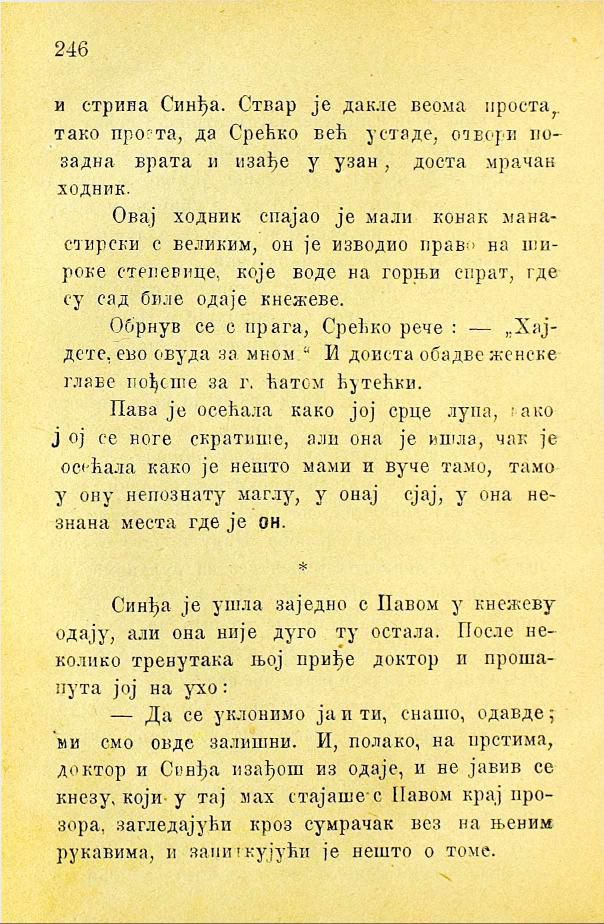 - Да се уклонимо ја и ти, снашо, одавде; ми смо овде залишни. И, полако, на прстима, доктор и Синђа изађоше из одаје, и не јавив се кнезу, који у тај мах стајаше с Павом крај прозора, загледајући кроз сумрачак вез на њеним рукавима, и запиткујући је нешто о томе.