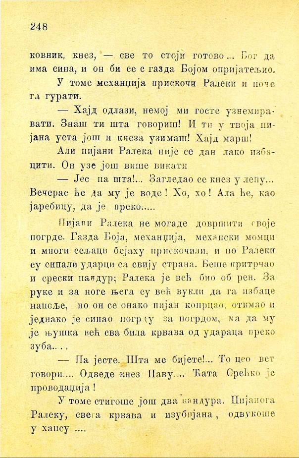 Пијани Ралека не могаде довршити своје погрде. Газда Боја, механџија, механски момци и многи сељаци бејаху прискочили, и по Ралеки су сипали ударци са свију страна. Беше притрчао и срески пандур; Ралека је већ био оборен. За руке и за ноге њега су већ вукли да га избаце напоље, но он се онако пијан копрцао, отимао и једнако је сипао погрду за погрдом, ма да му је њушка већ сва била крвава од удараца преко зуба...