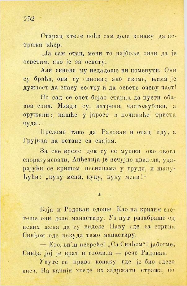 Боја и Радован одоше. Као на крилима слетеше они доле манастиру. Уз пут разабраше од неких жена да су виделе Паву где са стрина Синђом оде некуда тамо манастиру.