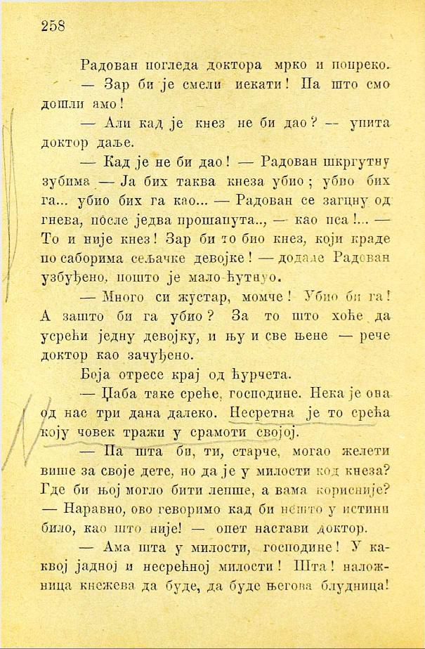 - Кад је не би дао! — Радован шкргутну зубима — Ја бих таква кнеза, убио; убио бих га... убио бих га као... — Радован се загцну од гнева, после једва прошапута.., —. као пса!... - То и није кнез! Зар би то био кнез, који краде по саборима сељачке девојке! — додаде Радован узбуђено, пошто је мало ћутнуо.