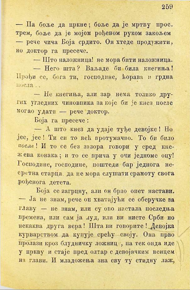 Боја се загрцну, али он брзо опет настави. — Ја не знам, рече он хватајући се оберучке за главу — не знам, или су ово настала последња времена, или сам ја луд, или ви нисте Срби но некаква друга вера! Шта ви говорите! Девојка курварством да купује срећу своју. Она прво пролази кроз блудничку ложницу, па тек онда иде у цркву и стаје пред олтар с девојачким венцем на глави. И младожења зна сву ту стидну лаж,