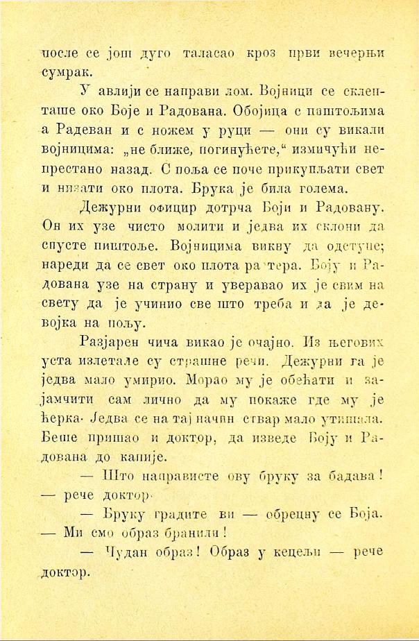 У авлији се направи лом. Војници се склепташе око Боје и Радована. Обојица с пиштољима а Радован и с ножем у руци — они су викали војницима: „не ближе, погинућете,“ измичући непрестано назад. С поља се поче прикупљати свет и низати око плота. Брука је била голема.