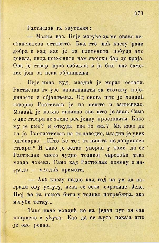 Није имао куд, младић је морао остати. Растислав га узе запиткивати за стотину појединости и објашњења. Од онога што је младић говорио Растислав је по нешто и записивао. Младић је вољно казивао све што је знао. Само о две ствари не хтеде реч једну прословити: Како му је име? и откуда све то зна? Ма како да га је Растислав на то наводио, младић је увек одговарао: „Што ће то; то ништа не доприноси ствари.“ И тако је остао упоран у томе да се Растислав чисто чудио толикој чврстоћи тако млада човека. Само кад Растислав помену о награди — младић примети.