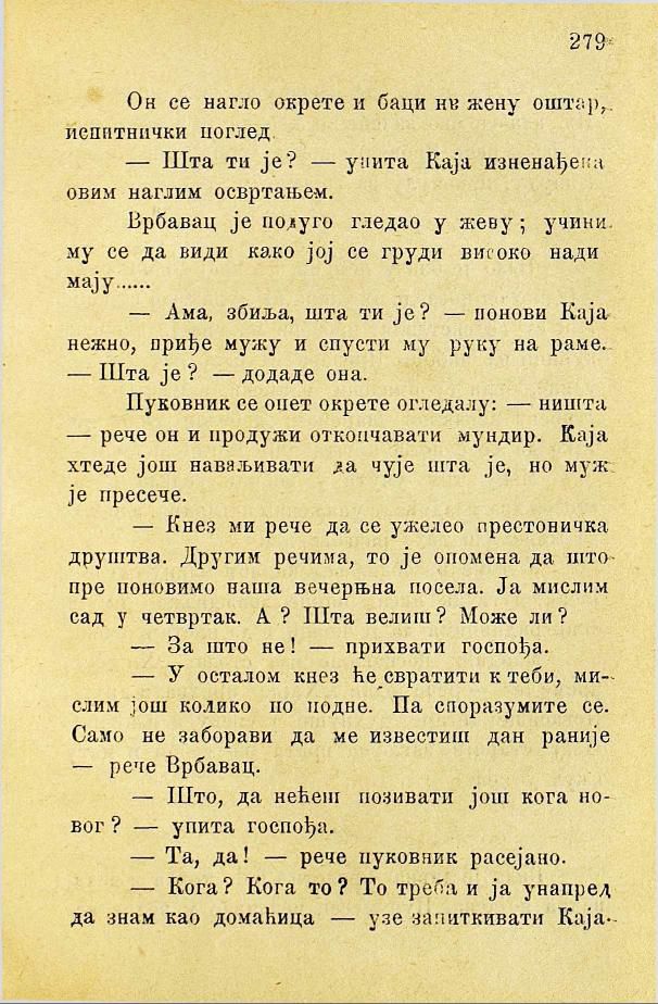 Пуковник се опет окрете огледалу: — ништа — рече он и продужи откопчавати мундир. Каја хтеде још наваљивати да чује шта је, но муж је пресече.