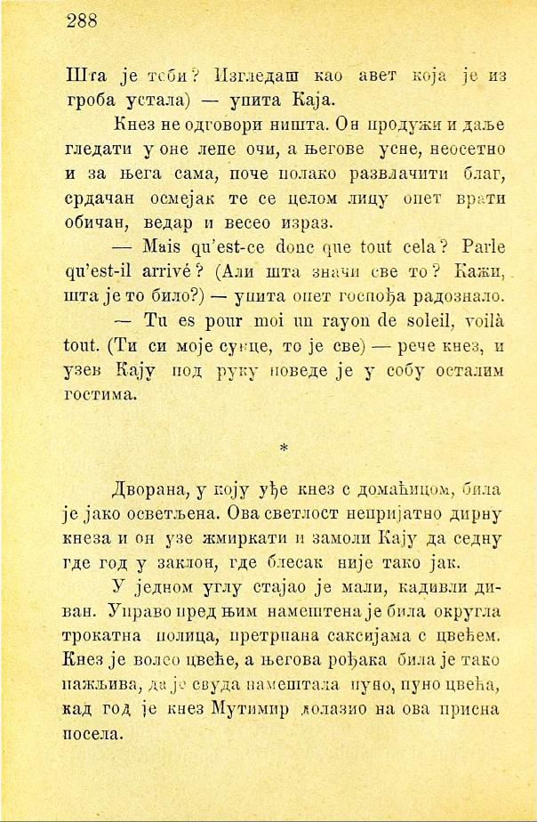 Кнез не одговори ништа. Он продужи и даље гледати у оне лепе очи, а његове усне, неосетно и за њега сама, поче полако развлачити благ, срдачан осмејак те се целом лицу опет врати обичан, ведар и весео израз.