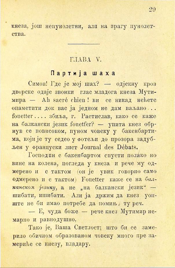 Господин с бакенбартом спусти полако новине на колена, погледа у кнеза и рече му одмерено и с тактом (он је увек говорио само одмерено и с тактом) балканском језику, а не „на балкански језик“ — шибати, ишибати. Али ја држим да кнез уопште не би имао потребе да помиње ту реч.