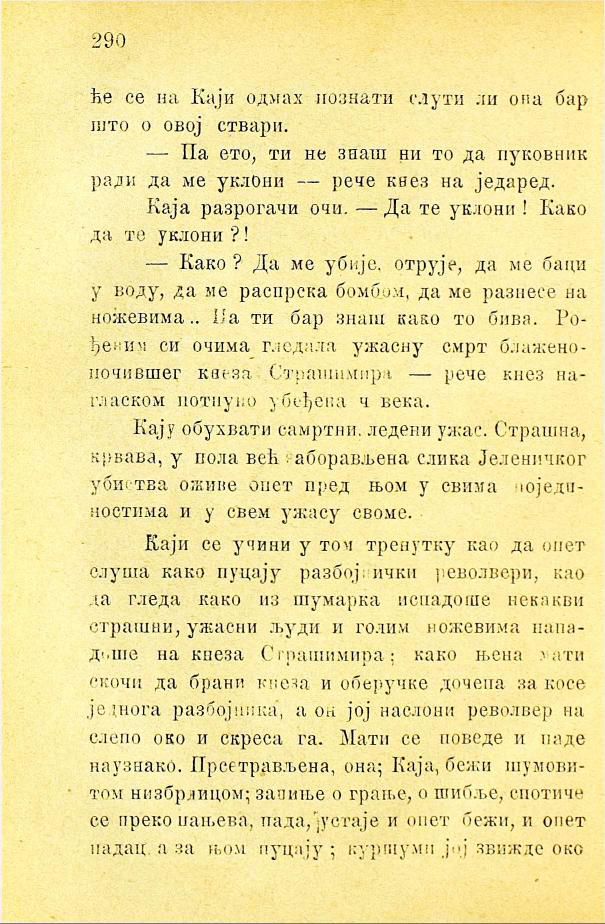 Каји се учини у том тренутку као да опет слуша како пуцају разбојнички револвери, као да гледа како из шумарка испадоше некакви страшни, ужасни људи и голим ножевима нападоше на кнеза Страшимира; како њена мати скочи да брани кнеза и оберучке дочепа за косе једнога разбојника, а он јој наслони револвер на слепо око и скреса га. Мати се поведе и паде наузнако. Престрављена, она, Каја, бежи шумовитом низбрдицом; запиње о грање, о шибље, спотиче се преко пањева, пада, устаје и опет бежи, и опет пада, а за њом пуцају; куршуми јој звижде око