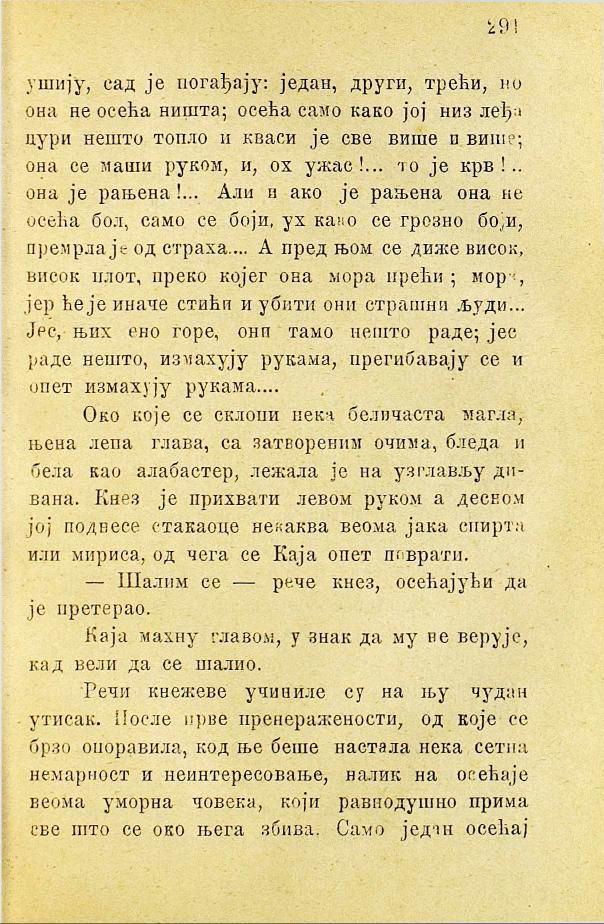 Око које се склопи нека беличаста магла, њена лепа глава, са затвореним очима, бледа и бела као алабастер, лежала је на узглављу дивана. Кнез је прихвати левом руком а десном јој поднесе стакаоце некаква веома јака спирта или мириса, од чега се Каја опет поврати.
