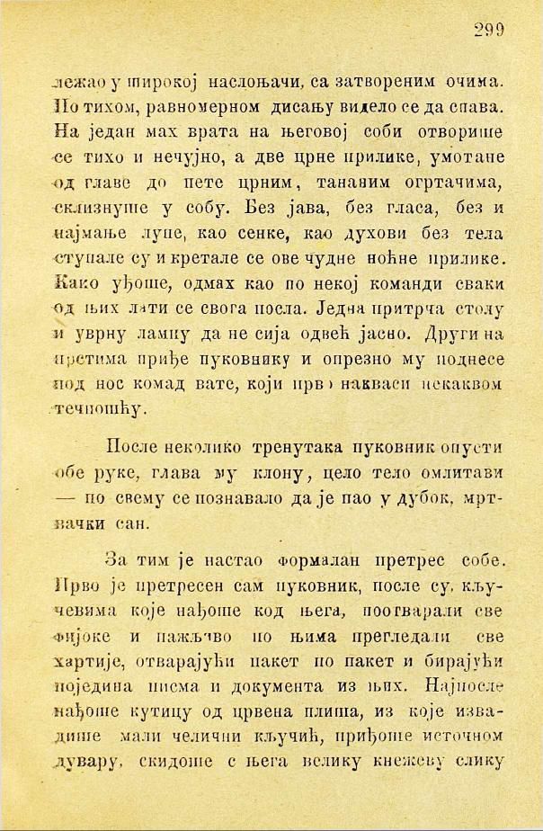За тим је настао формалан претрес собе. Прво је претресен сам пуковник, после су кључевима које нађоше код њега, поотварали све фијоке и пажљиво по њима прегледали све хартије, отварајући пакет по пакет и бирајући поједина писма и документа из њих. Најпосле нађоше кутицу од црвена плиша, из које извадише мали челични кључић, приђоше источном дувару, скидоше с њега велику кнежеву слику