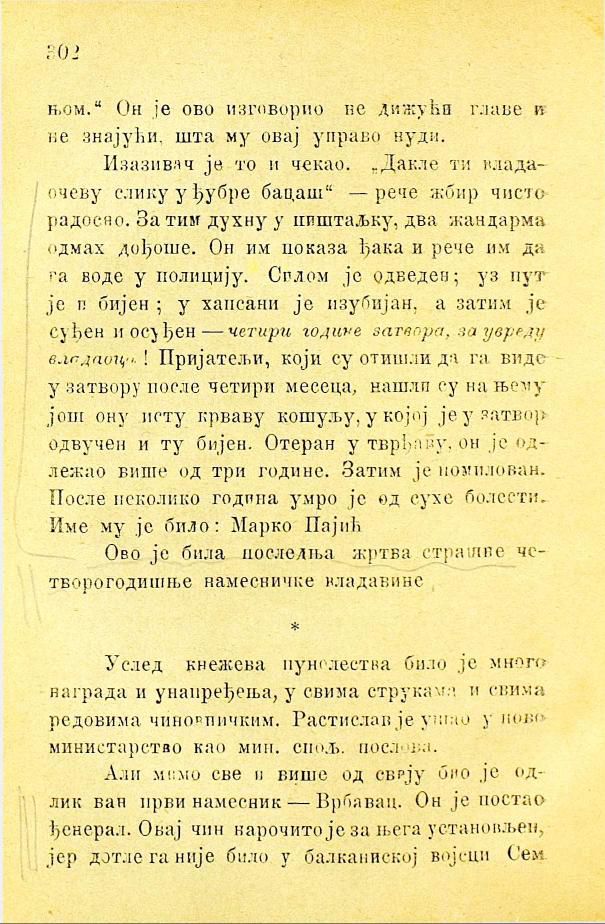 Изазивач је то и чекао. „Дакле ти владаочеву слику у ђубре бацаш“ — рече жбир чисто радосно. За тим духну у пиштаљку, два жандарма одмах дођоше. Он им показа ђака и рече им да га воде у полицију. Силом је одведен; уз пут је и бијен; у хапсани је изубијан, а затим је суђен и осуђен — четири године затвора, за увреду владаоца.! Пријатељи, који су отишли да га виде у затвору после четири месеца, нашли су на њему још ону исту крваву кошуљу, у којој је у затвор одвучен и ту бијен. Отеран у тврђаву, он је одлежао више од три године. Затим је помилован. После неколико година умро је од сухе болести. Име му је било: Марко Пајић.