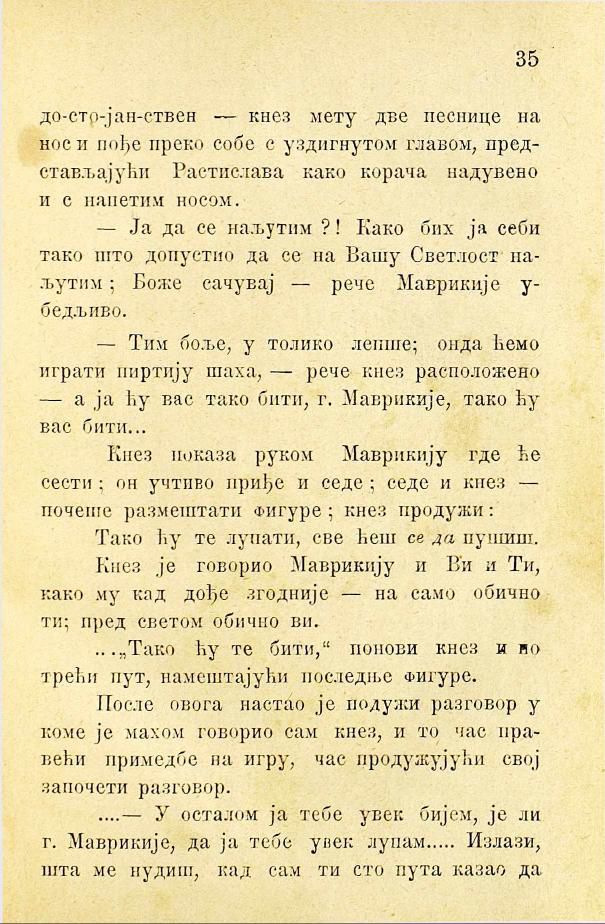 Кнез показа руком Маврикију где ће сести; он учтиво приђе и седе; седе и кнез — почеше размештати фигуре; кнез продужи: