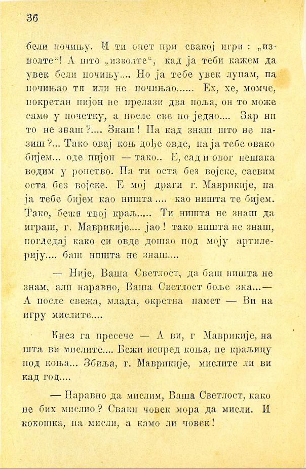 бели почињу. И ти опет при свакој игри: „изволте“! А што „изволте“, кад ја теби кажем да увек бели почињу.... Но ја тебе увек лупам, па почињао ти или не почињао... Ех, хе, момче, покретан пијон не прелази два поља, он то може само у почетку, а после све по једно.... Зар ни то не знаш?.... Знаш! Па кад знаш што не пазиш?... Тако овај коњ дође овде, па ја тебе овако бијем... оде пијон — тако.. Е, сад и овог пешака водим у ропство. Па ти оста без војске, сасвим оста без војске. Е мој драги г. Маврикије, па ја тебе бијем као ништа.... као ништа те бијем. Тако, бежи твој краљ... Ти ништа не знаш да играш, г. Маврикије.... јао! тако ништа не знаш, погледај како си овде дошао под моју артилерију.... баш ништа не знаш....