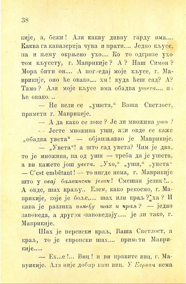 — „Увета“! а што сад увета? Чим је два, то је множина, па од уши треба да је ушета, а ви кажете још увета. „Ухо,“ „уши,“ „увета“ — балкански језик! Смешан језик!... А овде, шах краљу.. Елем, како рекосмо, г. Маврикије, које је боље шах или краљ? ха? И кава је разлика између шах и краљ? — један заповеда, а другом заповедају је ли тако, г. Маврикије.