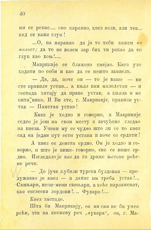 — Да, да, поче он — то је ваше — ви - сте правили устав... а књаз вам малолетан — и господа хитају да праве устав, а књаза и не лита нико. И Ви сте, г. Маврикије, правили устав — Паметан устав!