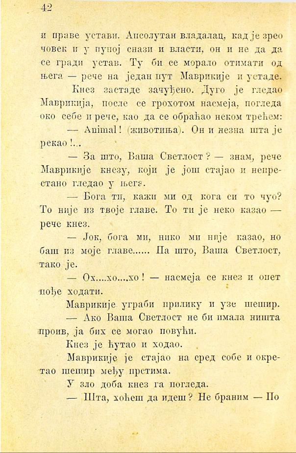 Кнез застаде зачуђено. Дуго је гледао Маврикија, после се грохотом насмеја, погледа око себе и рече, као да се обраћао неком трећем.