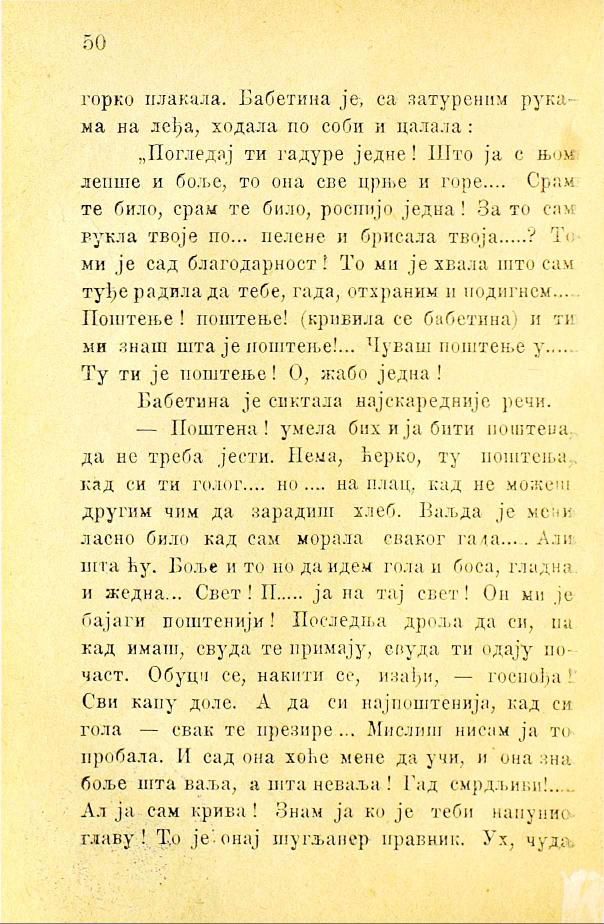 „Погледај ти гадуре једне! Што ја с њом, лепше и боље, то она све црње и горе.... Срам те било, срам те било, роспијо једна! За то сам вукла твоје по... пелене и брисала твоја...? То ми је сад благодарност! То ми је хвала што сам туђе радила да тебе, гада, отхраним и подигнем... Поштење! поштење! (кривила се бабетина) и ти ми знаш шта је поштење!... Чуваш поштење у... Ту ти је поштење! О, жабо једна!