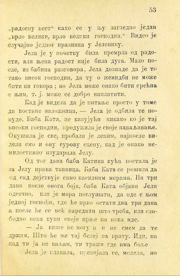 Кад је видела да је питање просто у томе да постане наложница, — Јела је одбила те понуде. Баба Ката, не казујући никако ко је тај високи господин, продужила је своје наваљивање. Окушала је све, пробала је лепим, најпосле видели смо и ону сурову сцену, кад је онако немилостивно изударала Јелу.