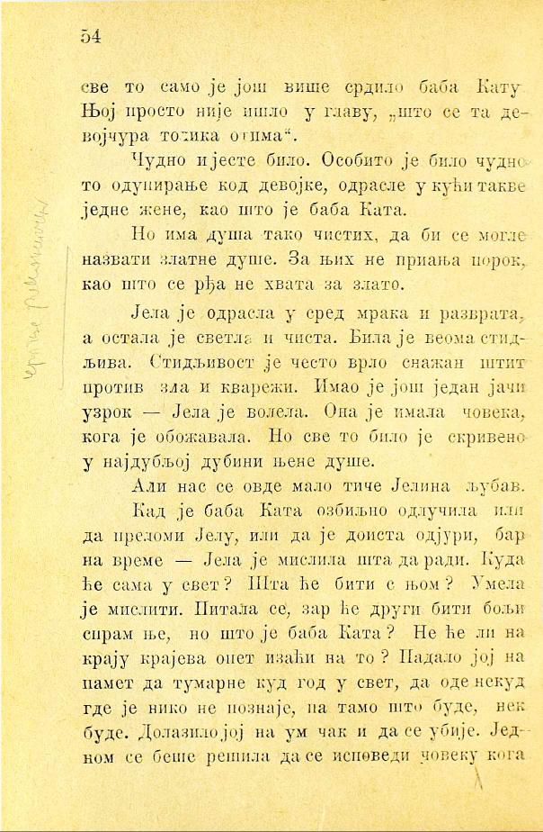 Кад је баба Ката озбиљно одлучила или да преломи Јелу, или да је доиста одјури, бар на време — Јела је мислила шта да ради. Куда ће сама у свет? Шта ће бити с њом? Умела је мислити. Питала се, зар ће други бити бољи спрам ње, но што је баба Ката? Не ће ли на крају крајева опет изаћи на то? Падало јој на памет да тумарне куд год у свет, да оде некуд где је нико не познаје, па тамо што буде, нек буде. Долазило јој на ум чак и да се убије. Једном се беше решила да се исповеди човеку кога