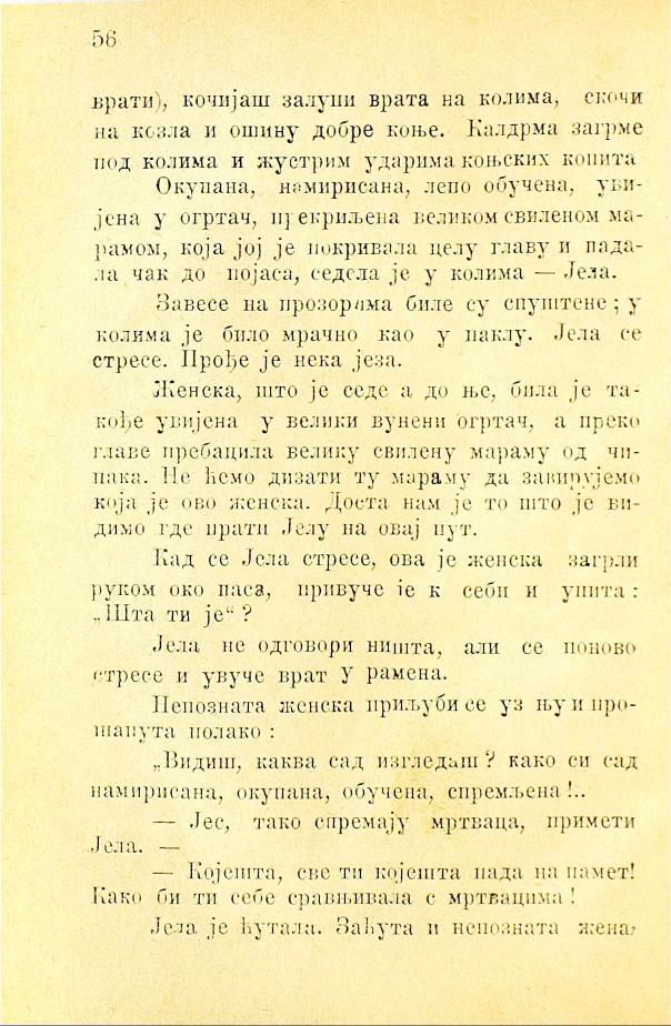 Окупана, намирисана, лепо обучена, увијена у огртач, прекриљена великом свиленом марамом, која јој је покривала целу главу и падала чак до појаса, седела је у колима — Јела.