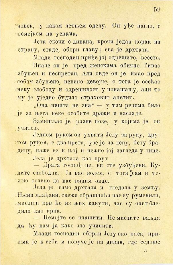 Иначе он је пред женскима обично бивао збуњен и неспретан. Али овде он је имао пред собом збуњено, невино девојче, с тога је осећао неку слободу и одрешивост у понашању, али то му је уједно будило страховит апетит.