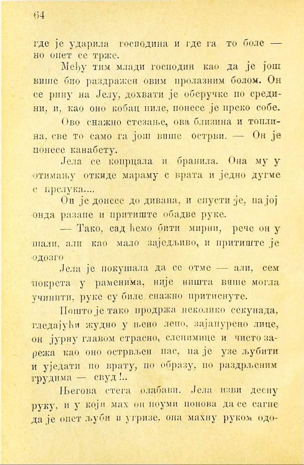 Међу тим млади господин као да је још више био раздражен овим пролазним болом. Он се рину на Јелу, дохвати је оберучке по средини, и, као оно кобац пиле, понесе је преко собе.
