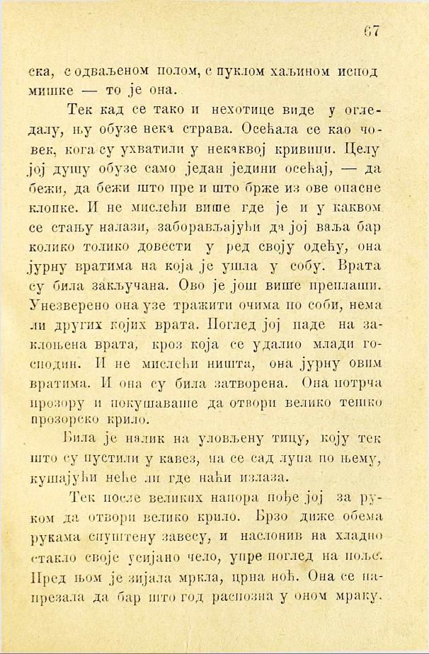 Тек кад се тако и нехотице виде у огледалу, њу обузе нека страва. Осећала се као човек, кога су ухватили у некаквој кривици. Целу јој душу обузе само један једини осећај, — да бежи, да бежи што пре и што брже из ове опасне клопке. И не мислећи више где је и у каквом се стању налази, заборављајући да јој ваља бар колико толико довести у ред своју одећу, она јурну вратима на која је ушла у собу. Врата су била закључана. Ово је још више преплаши. Унезверено она узе тражити очима по соби, нема ли других којих врата. Поглед јој паде на заклоњена врата, кроз која се удалио млади господин. И не мислећи ништа, она јурну овим вратима. И она су била затворена. Она потрча прозору и покушаваше да отвори велико тешко прозорско крило.