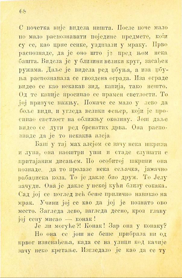 Ваш у тај мах алејом се зачу нека шкрипа и лупа, она наоштри уши и стаде слушати с притајаним дисањем. По особитој шкрипи она познаде, да то пролазе нека сељачка, јамачно рабаџиска кола. То је дакле био друм. То Јелу зачуди. Она је дакле у некој кући близу сокака. Сад јој се поглед већ беше прилично навикао на мрак. Учини јој се као да јој је познато ово место. Загледа лево, загледа десно, кроз главу јој сену мисао — конак!