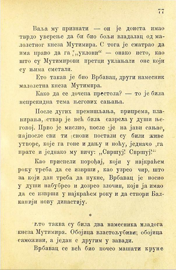 Као приспели порођај, који у најкраћем року треба да се изврши, као узрео чир, што за који дан треба да пукне, Врбавац је носио у души набубрео и дозрео злочин, који ја имао да се изврши у најкраћем року и да створи Балканији нову династију.