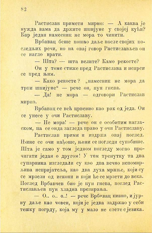 — О.. о.. о..! — рече Врбавац кивно, и јурну даље као човек, који је једва задржао у себи тешку погрду, која му у мало не слете с језика.