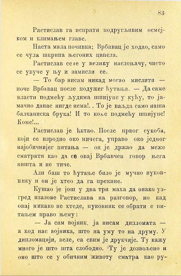 — То бар нисам никад могао мислити — поче Врбавац после подужег ћутања. — Да саме власти подмећу људима шпијуне у кућу, то јамачно данас нигде нема!.. То је ваљда само наша балканиска брука! И то коме подмећу шпијуне! Коме!...