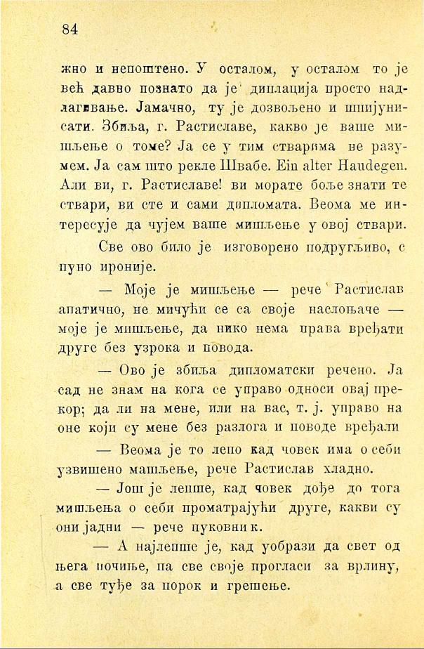 и непоштено. У осталом, у осталом то је већ давно познато да је диплација просто надлагивање. Јамачно, ту је дозвољено и шпијунисати. Збиља, г. Растиславе, какво је ваше мишљење о томе? Ја се у тим стварима не разумем. Ја сам што рекле Швабе.