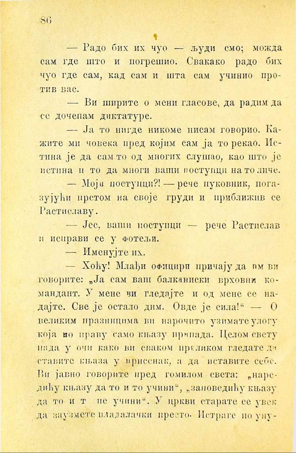 - Хоћу! Млађи официри причају да им ви говорите: „Ја сам ваш балканиски врховни командант. У мене ви гледајте и од мене се надајте. Све је остало дим. Овде је сила!“ - О великим празницима ви нарочито узимате улогу која по праву само књазу припада. Целом свету пада у очи како ви сваком приликом гледате да ставите књаза у присенак, а да иставите себе. Ви јасно говорите пред гомилом света: „наредићу књазу да то и то учини“, „заповедићу књазу да то и ти не учини“. У цркви старате се увек да заузмете владалачки престо. Истраге по унутрашњости