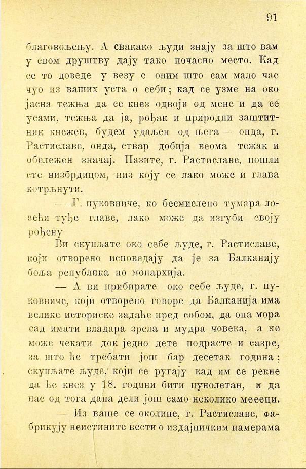 — А ви прибирате око себе људе, г. пуковниче, који отворено говоре да Балканија има велике историске задаће пред собом, да она мора сад имати владара зрела и мудра човека, а не може чекати док једно дете подрасте и сазре, за што ће требати још бар десетак година; скупљате људе, који се ругају кад им се рекне да ће кнез у 18. години бити пунолетан, и да нас од тога дана дели још само неколико месеци.