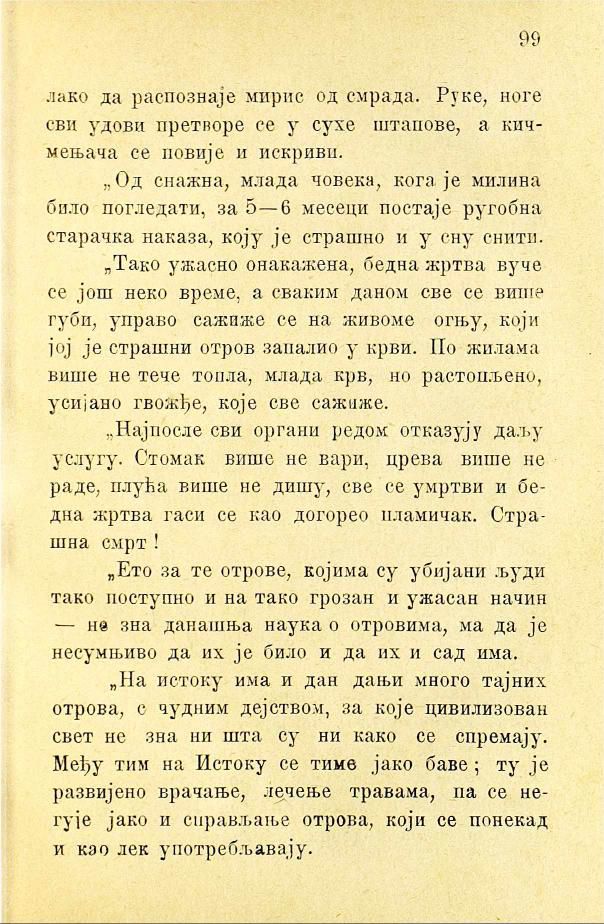 „Ето за те отрове, којима су убијани људи тако поступно и на тако грозан и ужасан начин — не зна данашња наука о отровима, ма да је несумњиво да их је било и да их и сад има.