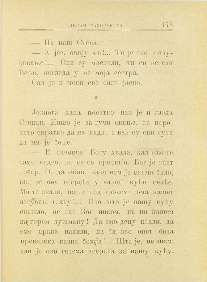 — Е, синовче, Богу хвала, кад сам те само видео, да си се предиг’о. Бог је опет добар. О, да знаш, како нам је свима било, кад те она несрећа у нашој кући снађе. Ми те звали, па да под кровом дома нашег изгубиш главу!... Ово што је нашу кућу снашло, не дао Бог ником, па ни нашем најгорем душману! Да смо децу клали, да смо цркве палили, па би ово опет била превелика казна божја!... Шта је, не знам, али је ово голема несрећа за нашу кућу.