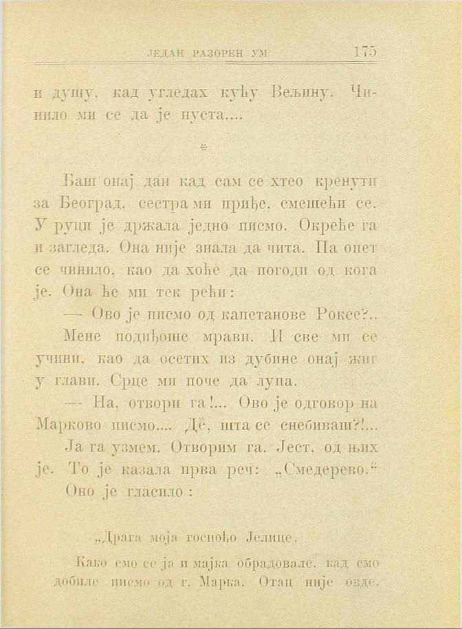 — Ово је писмо од капетанове Роксе?. Мене подиђоше мрави. И све ми се учини, као да осетих из дубине онај жиг у глави. Срце ми поче да лупа.