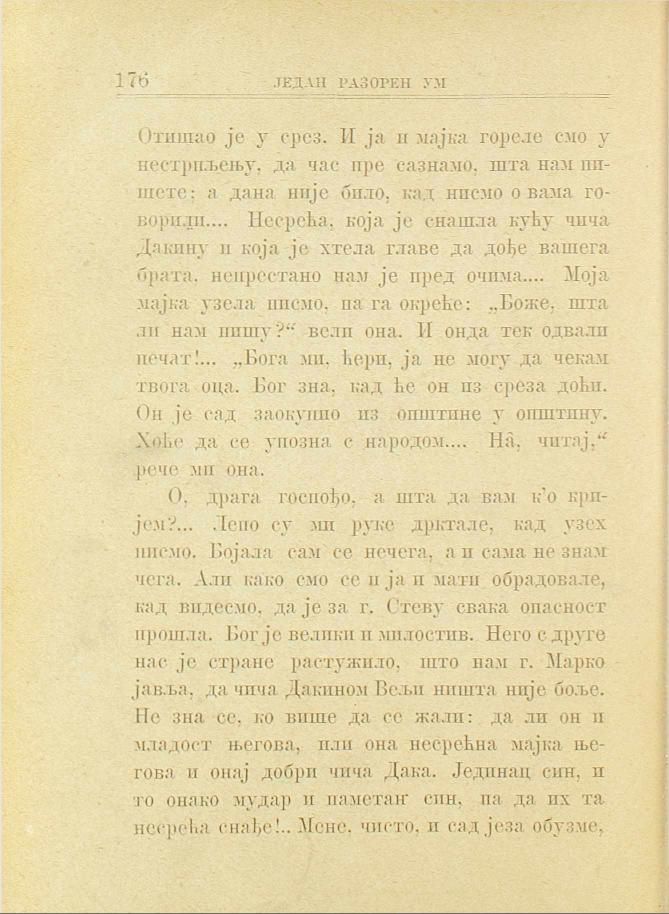 Отишао је у срез. И ја и мајка гореле смо у нестрпљењу, да час пре сазнамо, шта нам пишете; а дана није било, кад нисмо о вама говорили.... Несрећа, која је снашла кућу чича Дакину и која је хтела главе да дође вашега брата, непрестано нам је пред очима.... Моја мајка узела писмо, па га окреће: „Боже, шта ли нам пишу?“ вели она. И онда тек одвали печат!... „Бога ми, ћери, ја не могу да чекам твога оца. Бог зна, кад ће он из среза доћи. Он је сад заокупио из општине у општину. Хоће да се упозна с народом.... На, читај,“ рече ми она.