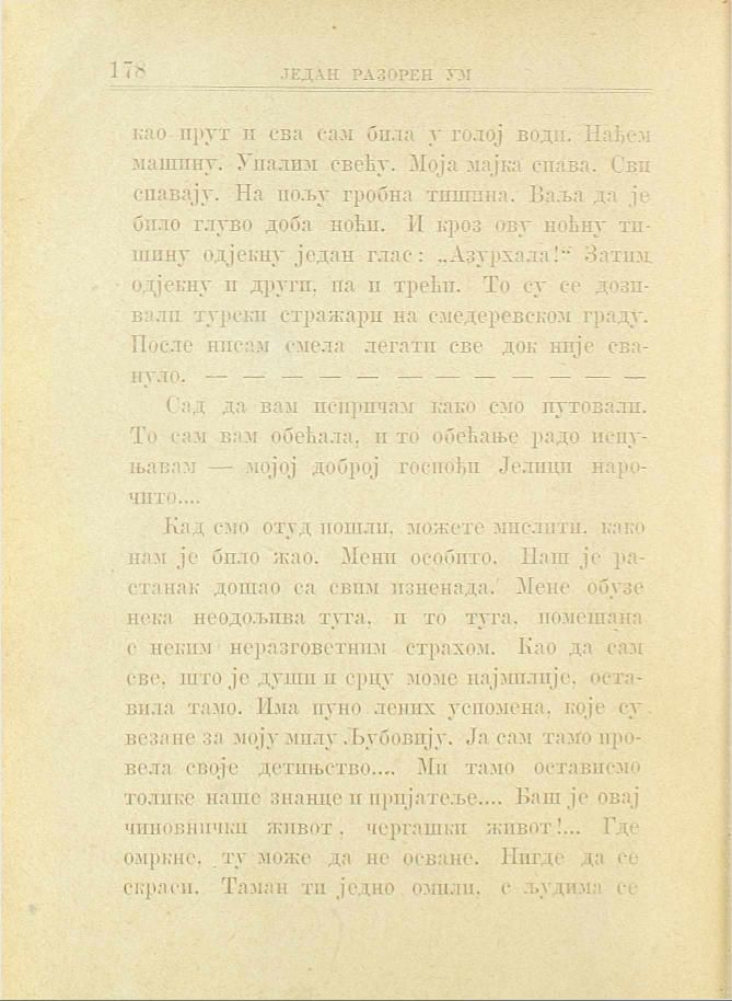 као прут и сва сам била у голој води. Нађем машину. Упалим свећу. Моја мајка спава. Сви спавају. На пољу гробна тишина. Ваља да је било глуво доба ноћи. И кроз ову ноћну тишину одјекну један глас: „Азурхала!“ Затим одјекну и други, па и трећи. То су се дозивали турски стражари на смедеревском граду. После нисам смела легати све док није свануло. — — — — — — — — — —