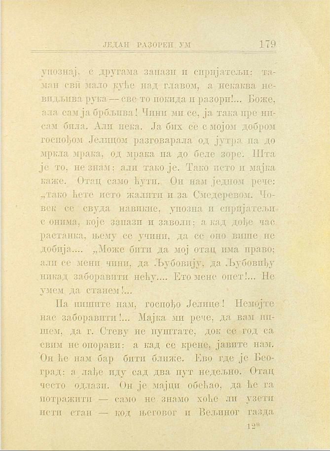 Па пишите нам, госпођо Јелице! Немојте нас заборавити!... Мајка ми рече, да вам пишем, да г. Стеву не пуштате, док се год са свим не опорави: а кад се крене, јавите нам. Он ће нам бар бити ближе. Ево где је Београд: а лађе иду сад два пут недељно. Отац често одлази. Он је мајци обећао, да ће га потражити — само не знамо хоће ли узети исти стан — код његовог и Вељиног газда