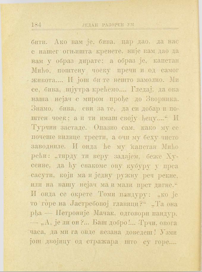 бити. Ако вам је, бива, цар дао, да нас с нашег огњишта кренете, није вам дао да нам у образ дирате: а образ је, капетан Мићо, поштену чоеку пречи и од самог живота.... И још би те нешто замолио. Ми се, бива, шјутра крећемо.... Гледај, да ова наша нејач с миром прође до Зворника. Знамо, бива, сви за те, да си добар и поштен чоек: а и ти имаш своју ђецу....“ И Турчин застаде. Опазио сам, како му се почеше вилице трести, а очи му беху чисто заводниле. И онда ће му капетан Мићо рећи: „тврду ти веру задајем, беже Хусеине, да ћу свакоме ову кубуру у прса сасути, који ма и једну ружну реч рекне, или на вашу нејач ма и мали прст дигне.“ И онда се окрете Томи пандуру: „ко је то горе на Јастребовој главици?“ „Та она рђа — Петроније Мачак, одговори пандур. — „ А, је ли он?... Баш добро!... Трчи, овога часа, да ми га овде везана доведеш! Узми још двојицу од стражара што су горе....