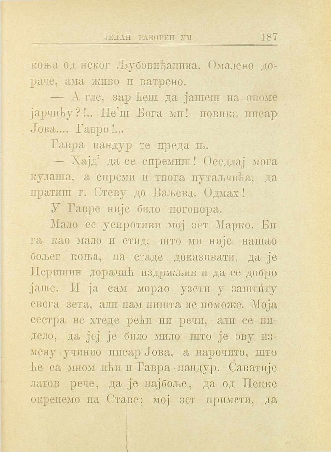 — А гле, зар ћеш да јашеш на овоме јарчићу?!.. Не’ш Бога ми! повика писар -Јова.... Гавро!...