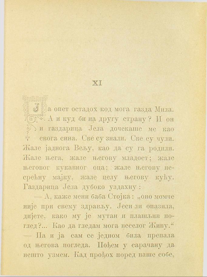Ја опет остадох код мога газда Мила. А и куд би ни другу страну? И он и газдарица Јела дочекаше ме као свога сина. Све су знали. Све су чули. Жале јаднога Вељу, као да су га родили. Жале њега, жале његову младост; жале његовог кукавног оца; жале његову несрећну мајку, жале целу његову кућу. Газдарица Јела дубоко уздахну: