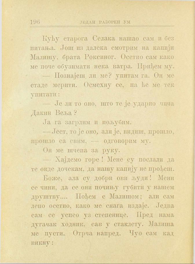 Кућу старога Селака нашао сам и без питања. Још из далека смотрим на капији Малишу, брата Роксиног. Осетио сам како ме поче обузимати нека ватра. Приђем му.