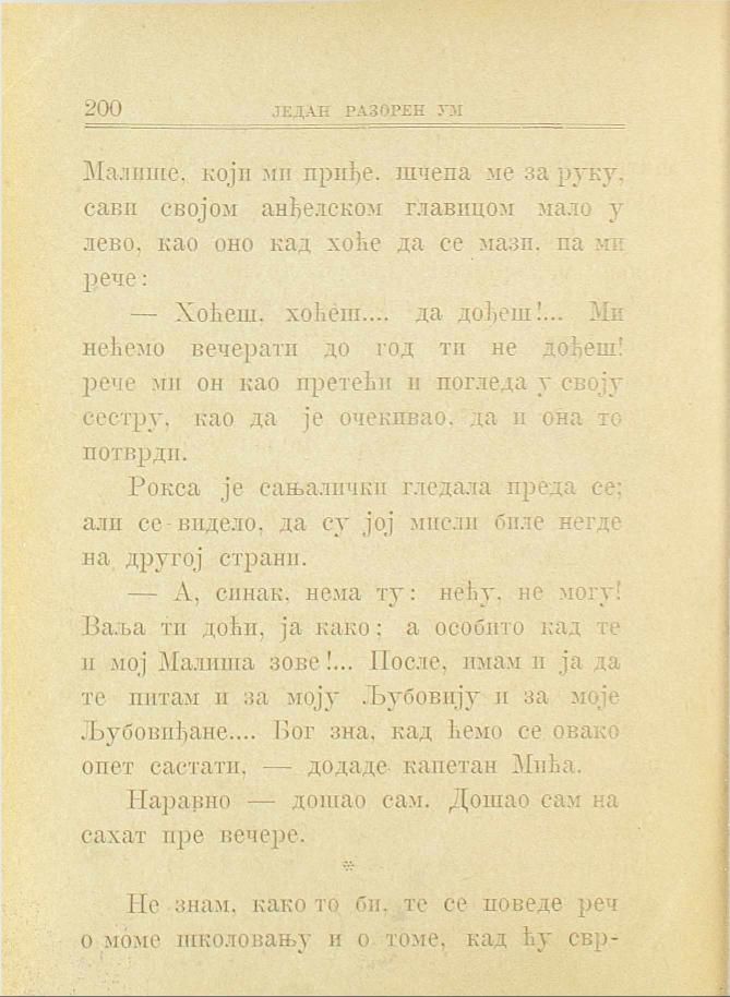 — А, синак, нема ту: нећу, не могу! Ваља ти доћи, ја како; а особито кад те и мој Малиша зове!... После, имам и ја да те питам и за моју Љубовију и за моје Љубовиђане.... Бог зна, кад ћемо се овако опет састати, — додаде капетан Мића.