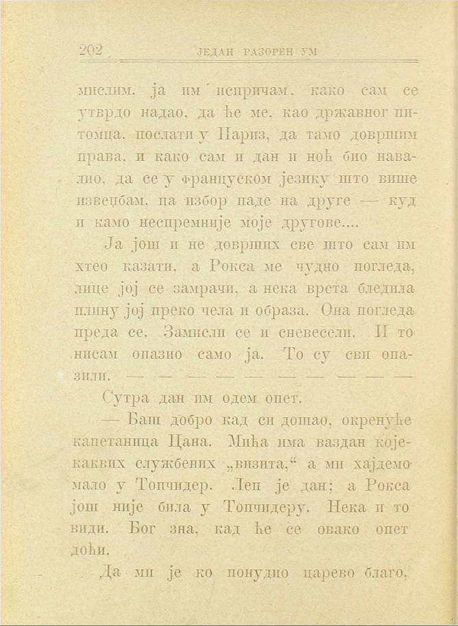 Ја још и не доврших све што сам им хтео казати, а Рокса ме чедно погледа, лице јој се замрачи, а нека врста бледила плину јој преко чеда и образа. Она погледа преда се. Замисли се и сневесели. И то нисам опазио само ја. То су сви опазили. — — — — — — — — — — —