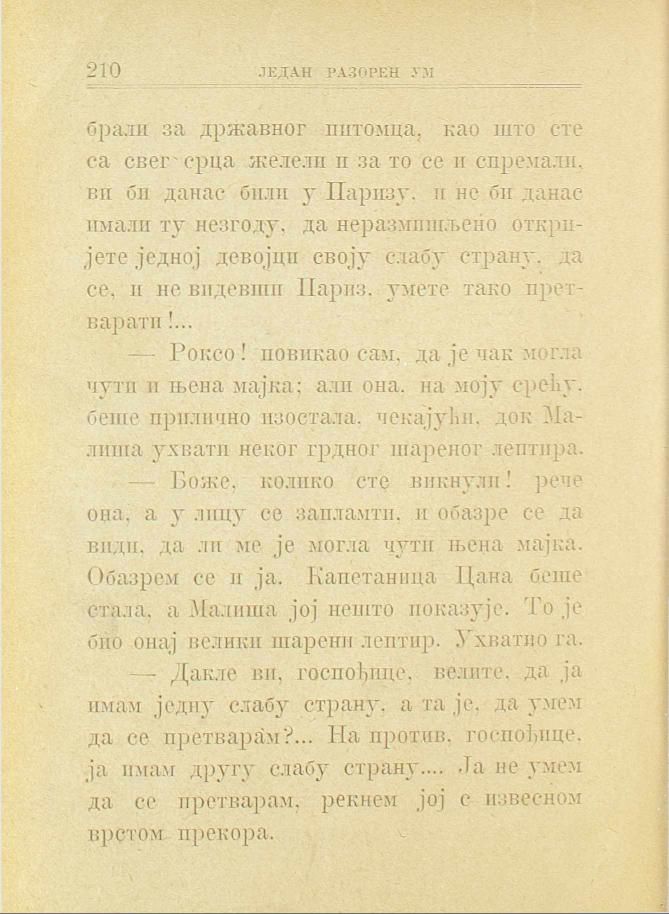 — Дакле ви, госпођице, волите, да ја имам једну слабу страну, а та је, да умем да се претварам?... На против, госпођице, ја имам другу слабу страну.... Ја не умем да се претварам, рекнем јој с извесном врстом прекора.