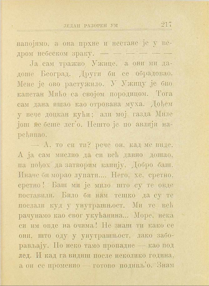 Ја сам тражио Ужице, а они ми дадоше Београд. Други би се обрадовао. Мене је ово растужило. У Ужицу је био капетан Мићо са својом породицом. Тога сам дана ишао као отрована муха. Дођем у вече доцкан кући: али мој газда Миле још не беше лег’о. Нешто је по авлији наређивао.