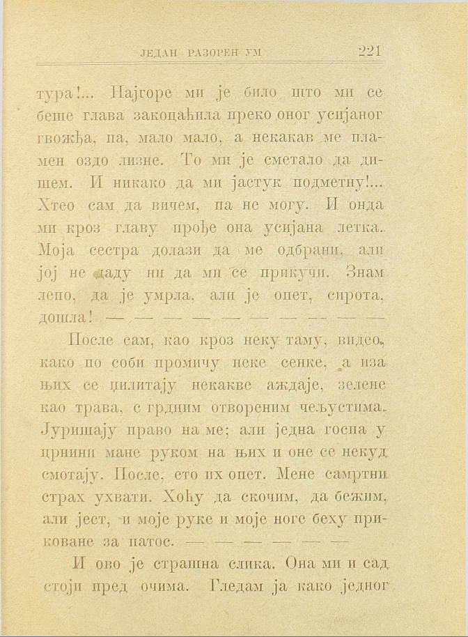 Најгоре ми је било што ми се беше глава закоцаћила преко оног усијаног гвожђа, па, мало мало, а некакав ме пламен оздо лизне. То ми је сметало да дишем. И никако да ми јастук подметну!.... Хтео сам да вичем, па не могу. И онда ми кроз главу прође она усијана летка. Моја сестра долази да ме одбрани, али јој не даду ни да ми се прикучи. Знам лепо, да је умрла, али је опет, сирота, дошла! — — — — — — — — — — После сам, као кроз неку таму, видео, како по соби промину неке сенке, а иза њих се џилитају некакве аждаје, зелене као трава, с грдним отвореним чељустима. Јуришају право на ме; али једна госпа у црнини мане руком на њих и оне се некуд смотају. После, ето их опет. Мене самртни страх ухвати. Хоћу да скочим, да бежим, али јест, и моје руке и моје ноге беху приковане за патос. — — — — — —