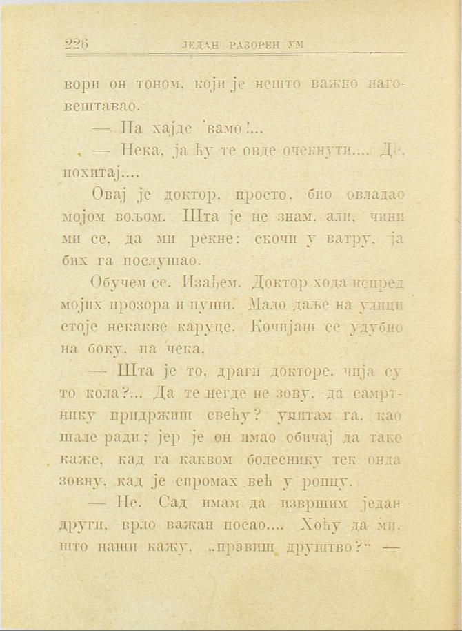— Шта је то, драги докторе, чија су то кола?... Да те негде не зову, да самртнику придржиш свећу? упитам га, као шале ради: јер је он имао обичај да тако каже, кад га каквом болеснику тек онда зовну, кад је сиромах већ у ропцу.