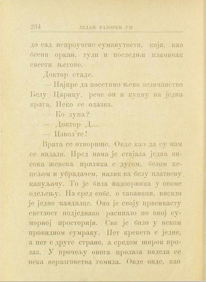 Врата се отворише. Овде као да су нам се надали. Пред нама је стајала једна висока женска прилика с дугом, белом кецељом и убрадачом, налик на белу платнену капуљачу. То је била надзорница у овоме одељењу. На сред собе, о таваници, висило је једно кандилце. Оно је своју црвенкасту светлост подједнако расипало по овој суморној просторији. Све је било у неком провидном сумраку. Пет кревета с једне, а пет с друге стране, а средом широк пролаз. У прочељу овога пролаза видела се нека неразговетна гомила. Овде онде, као